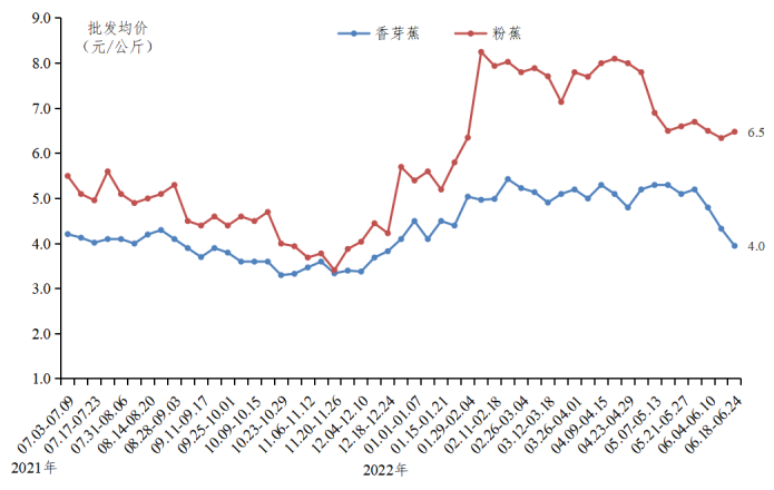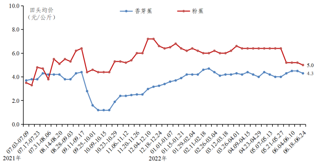 上半年全省香蕉田头行情处于较高水平,整体偏强运行,粉蕉田头均价为6.1元/公斤,香芽蕉田头均价为4.2元/公斤。