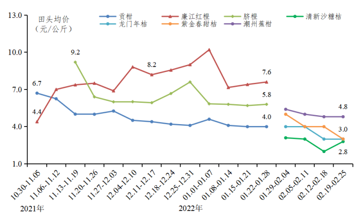 今年1-2月受柑橘市场收尾影响,行情整体回落,其中清新沙糖桔、龙门年桔、紫金春甜桔、潮州蕉柑等整体呈现高开低走态势。