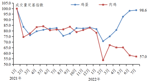 7月我省主要批发市场在新冠肺炎疫情影响下,肉鸡、鸡蛋流通量整体下降。据省农业信息监测体系数据,肉鸡批发市场成交量环比下降1.9%,鸡蛋成交量环比增加0.5%,其定基指数[ 定基指数:以该指标2021年1月数据为基期水平100。]分别为57.0、98.6,分别较上月减少1.1、增加0.5。