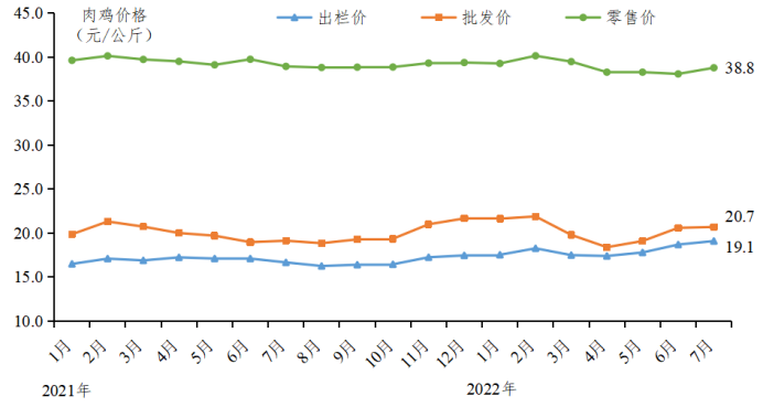 肉鸡价格上涨。7月在猪价上涨带来的替代性消费增加影响下,肉鸡价格上涨。据省农业信息监测体系数据,肉鸡出栏价为19.1元/公斤,环比上涨2.1%,批发价为20.7元/公斤,环比上涨0.5%。据地市“菜篮子”数据,白条鸡零售价为38.8元/公斤,环比上涨1.8%。