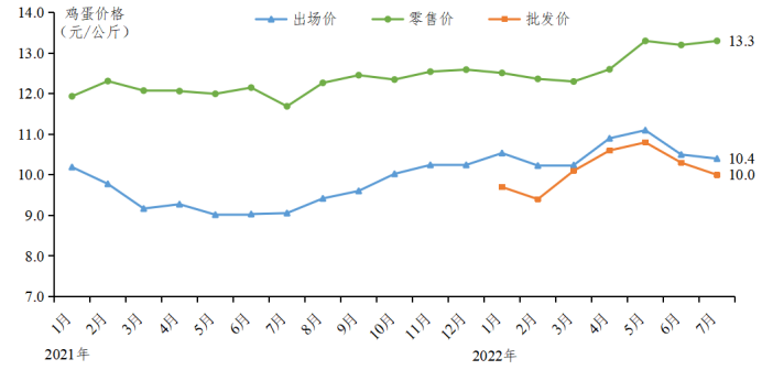 蛋价小幅回落。尽管在猪肉价格上涨背景下,鸡蛋替代消费增加,但由于在省外供应总体较多,省内鸡蛋价格未有较大涨幅,整体表现平稳。鸡蛋出场价为10.4元/公斤,环比下降1.0%;市场批发价10.0元/公斤,环比下降2.9%。据地市“菜篮子”价格数据,鸡蛋零售价为13.3元/公斤,环比上涨0.8%。