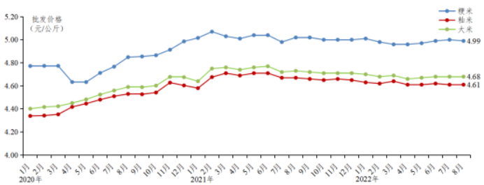 主要生产基地大米加工量稳定。8月省内自产大米走货量稳定,生产供应端大米加工量总体平稳。据省农业信息监测体系数据,8月主要生产基地普通籼米平均加工量约为700吨,丝苗米平均加工量约为300吨,大米加工量仍保持稳定水平。