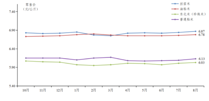 大米零售价格小幅上涨。据地级市“米袋子”数据,农贸市场大米6.46元/公斤,环比微涨0.5%,籼米6.51元/公斤,环比微涨0.5%,粳米6.03元/公斤,环比微降0.2%。其中丝苗米、油粘米、普通籼米、东北米(珍珠米)价格整体稳中有增。