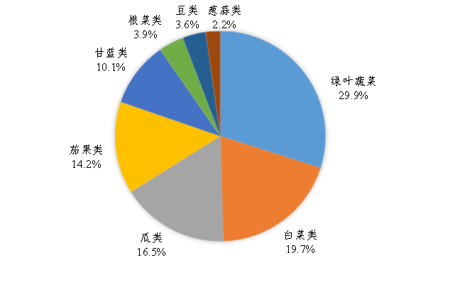 蔬菜在田面积减少。8月初及月末连续两次台风登陆我省,且高温炎热天气持续,据省农业信息监测体系数据,预计8月我省蔬菜在田面积313.3万亩,环比下降2.7%;与去年同期相比稳中略降。监测的规模基地在田蔬菜以绿叶蔬菜、白菜类和瓜类为主,在田面积占比分别为29.9%、19.7%和16.5%。分品种而言,空心菜、菜心和甘蓝在田面积较多,占比分别是17.8%、11.0%和8.3%。