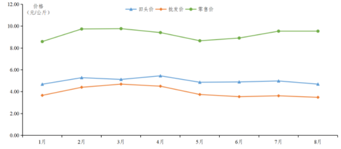据省农业信息监测体系数据,8月山东、贵州等地区瓜类蔬菜价格较低,对省内瓜类行情有一定影响,监测的省内规模基地瓜类蔬菜田头出售均价普遍下跌,带动规模基地主种蔬菜田头均价跌至4.69元/公斤,环比下跌5.8%。月初云南、山东等地区供给的苋菜和油麦菜价格偏低,使我省大型批发市场8月主要交易品种蔬菜批发均价跌至3.48元/公斤,环比下跌3.9%,下跌明显的是苋菜和油麦菜。零售均价9.54元/公斤,较上月涨0.25元/公斤,环比上涨2.7%,上涨明显的是四季豆、大番茄和花椰菜。