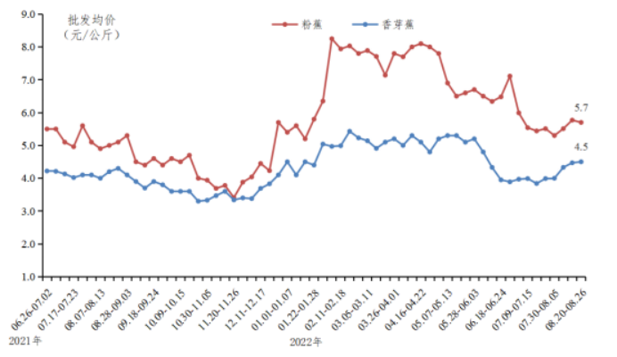 市场行情上涨略高于去年同期。省内主要批发市场香蕉批发均价为4.5元/公斤,环比上涨4.7%,同比上涨5.9%。其中粉蕉价格行情先涨后跌,前三周平稳上涨,第四周回落,本月批发均价为5.3元/公斤,环比下降5.5%,同比上涨9.2%;香芽蕉连续四周持续上涨,批发均价为4.3元/公斤,环比上涨8.9%,同比上涨4.6%。