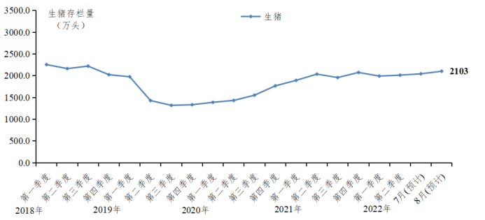 广东省生猪存栏总体增长。8月末生猪存栏预计为2103万头,环比增长3%,同比增长2%,其中能繁母猪环比增长2%,同比增长5%。