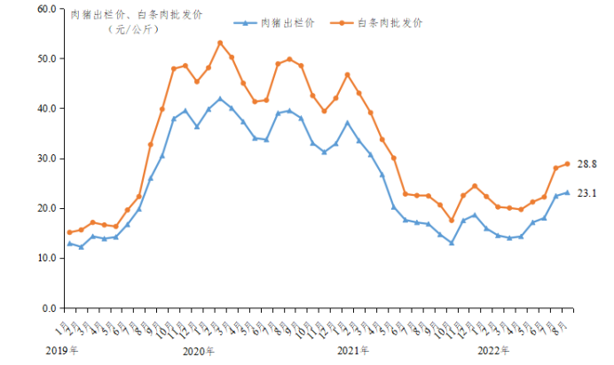 肉猪出栏月均价上涨。在市场供应减少、消费偏稳的背景下,商品肉猪出栏价出现较高涨幅,出栏均价为23.1元/公斤,环比上涨3%,每头肉猪价格2767元,环比增长2%。白条肉批发价为28.8元/公斤,环比上涨3%。