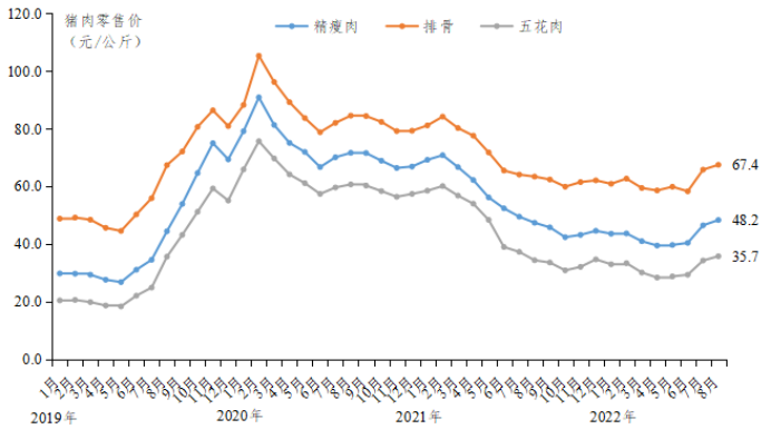 猪肉零售价整体上涨。排骨均价、精瘦肉均价和五花肉均价67.4元/公斤、48.2元/公斤和35.7元/公斤,环比分别上涨2.6%、4.1%、4.3%。