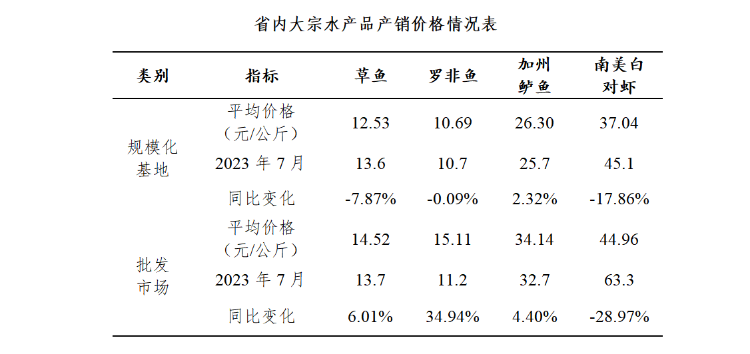 根据省农业信息监测体系数据,草鱼出塘均价12.53元/公斤,同比降低7.87%;罗非鱼出塘均价为10.69元/公斤,同比基本持平;加州鲈鱼26.30元/公斤,同比上涨2.32%;南美白对虾出塘均价37.04元/公斤,同比降低17.86%。