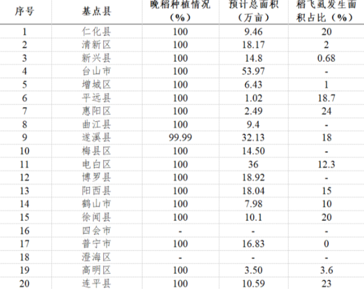 8月份全省20个基点县晚稻已基本完成种植,其中播种面积靠前的市县(区)有台山市、电白区和遂溪县,播种面积分别为53.97、36、32.13万亩。晚稻目前处于分蘖至拔节期。本月上旬到中旬我省出现大范围持续性的高温过程,部分地区晚稻秧苗出现了高温热害;部分县区水稻稻飞虱危害面积较大。