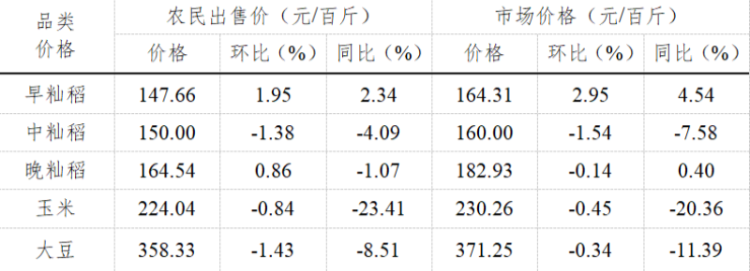 8月早籼稻的农民出售均价和市场价格分别为147.66元/百斤和164.31元/百斤,较上月和去年同期小幅上涨;中籼稻的农民出售均价和市场价格分别为150元/百斤和160元/百斤,价格同比和环比分别下跌4.09%和7.58%;晚籼稻的农民出售均价和市场价格分别为164.54元/百斤和182.93元/百斤,价格同比和环比保持相对稳定;玉米的农民出售均价和市场价格较去年同期分别下跌23.41%和20.36%,价格较7月保持相对稳定;大豆的农民出售均价和市场价格分别为358.33元/百斤和371.25元/百斤,较去年同期小幅下跌,环比较上月基本持平。