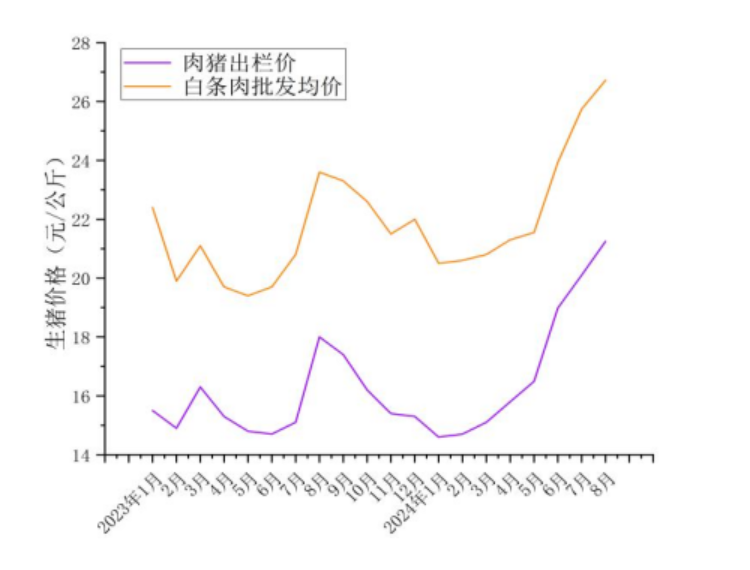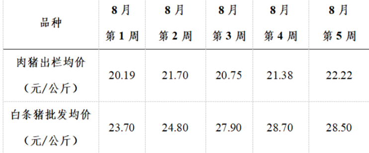 8月生猪价格振动上涨。根据省农业信息综合监测体系数据显示,8月肉猪出栏均价延续7月的涨势,持续上涨,8月第三周价格有少许下跌。8月最后一周肉猪出栏均价为本月最高值,上涨至22.22元/公斤;8月白条猪批发价格保持上涨趋势,8月第4周价格达到本月最高点,为28.70元/公斤。