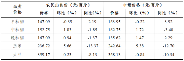 9月早籼稻的农民出售均价和市场价格分别为147.09元/百斤和163.95元/百斤,环比保持稳定,较去年同期小幅上涨;中籼稻的农民出售均价和市场价格分别为152.75元/百斤和162.75元/百斤,价格分别较上月上涨1.83%和1.72%;晚籼稻的农民出售均价和市场价格较上月小幅上涨,价格分别为167.09元/百斤和185.62元/百斤;玉米农民出售均价和市场价格较去年同期分别下跌13.37%和12.7%,环比上月出现上涨,涨幅5.66%和5.38%;大豆的农民出售均价和市场价格分别为359.17元/百斤和368.13元/百斤,环比保持稳定,同比小幅下跌。