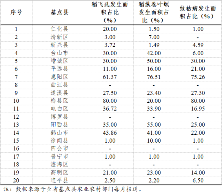 9月全省晚稻生育期不一,主要处于幼穗分化期和抽穗期。受台风“摩羯”登陆影响,导致细菌性条斑病和白叶枯病发生严重。根据全省基点县报送数据,多地出现稻飞虱迁入峰,危害严重的病虫害主要有稻飞虱、稻纵卷叶螟和纹枯病等。钻蛀性螟虫和稻叶瘟在粤北和粤西等地区以及感病品种区域偏重发生。