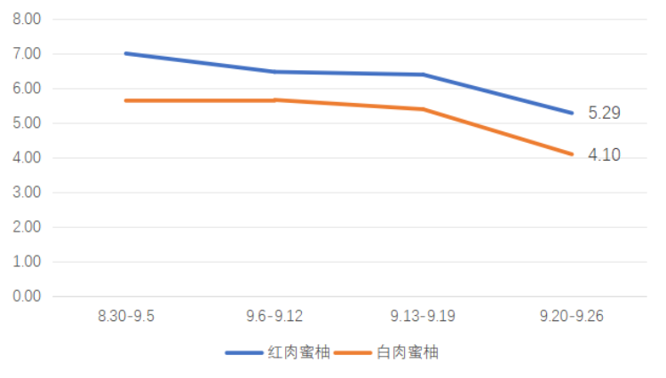9月蜜柚开始上市,月内市场价格呈下降趋势,但同比微涨。9月初红肉蜜柚和白肉蜜柚的批发均价分别为7.01元/公斤和5.65元/公斤,为本月最高值,伴随省外蜜柚陆续进入广东,蜜柚批发均价呈下降趋势。9月红肉蜜柚批发均价为6.34元/公斤,同比上涨0.63%;白肉蜜柚批发均价为5.58元/公斤,同比上涨3.33%。