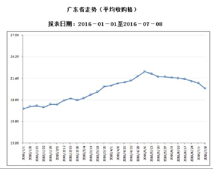 据对全省53家规模以上生猪定点屠宰样本企业监测统计,2016年7月4-7月10日,生猪平均收购价格为20.08元/公斤,较前一周下降3.28%,较去年同期上涨13.7%。本周较上周环比降幅较大的地区有东莞市10.19%,中山市7.35%,梅州市4.52%。