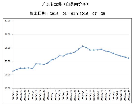 据对全省53家规模以上生猪定点屠宰样本企业监测统计,2016年7月25-7月31日,生猪平均收购价格为19.36元/公斤,较前一周下降1.22%,较去年同期上升1.68%。本周较上周环比降幅较大的地区有中山市4.31%,肇庆市3.63%,深圳市3.01%。