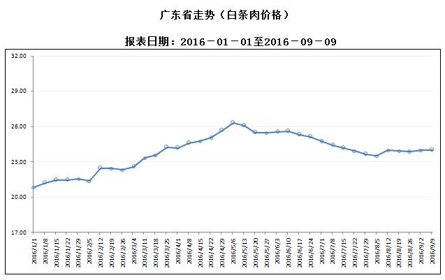 白条肉平均出厂价格为24元/公斤,较前一周上涨0.04%,较去年同期上涨5.12%。本周较上周环比涨幅较大的地区有汕尾市4.43%,珠海市2.70%,肇庆市0.88%。(畜禽屠宰管理处)