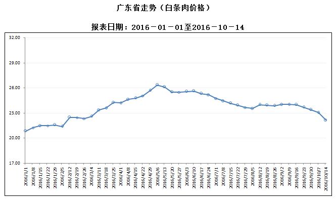 据对全省53家规模以上生猪定点屠宰样本企业监测统计,2016年10月10-16日,生猪平均收购价格为17.95元/公斤,较前一周下降4.37%,较去年同期下降0.77%。本周较上周环比降幅较大的地区有广州市10.75%,韶关市9.16%,中山市6.86%。