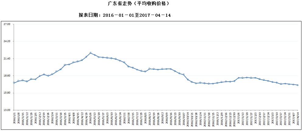 据对全省53家规模以上生猪定点屠宰样本企业监测统计,2017年4月8-14日,生猪平均收购价格为17.07元/公斤,较前一周下降0.52%,较去年同期下降18.33%。本周较上周环比降幅较大的地区有中山市3.24%,湛江市1.70%,茂名市1.64%,但仍有5个市呈上涨态势,其中珠海和梅州涨幅均超过1%。