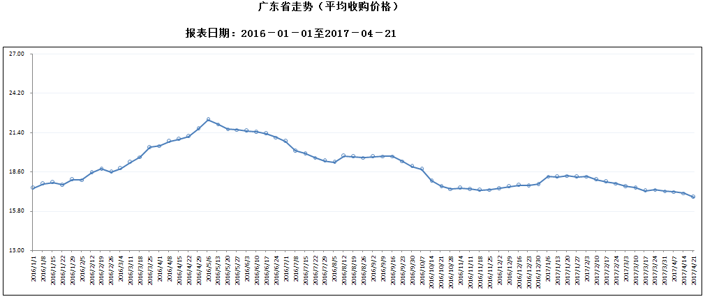 据对全省53家规模以上生猪定点屠宰样本企业监测统计,2017年4月15-21日,生猪平均收购价格为16.79元/公斤,较前一周下降1.64%,较去年同期下降20.46%。本周较上周环比降幅较大的地区有韶关市4.42%,深圳市3.18%,湛江市3.15%。