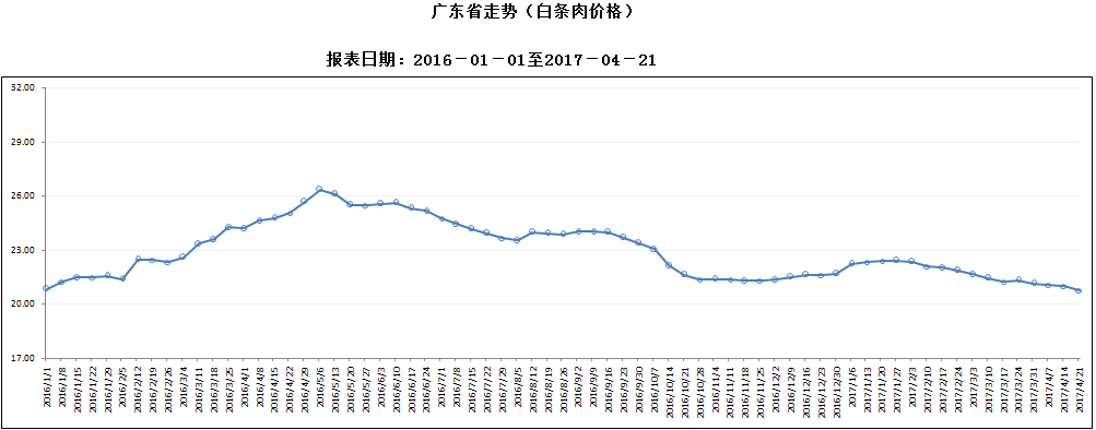 白条肉平均出厂价格为20.74元/公斤,较前一周下降1.14%,较去年同期下降17.17%。本周较上周环比降幅较大的地区有深圳市3.56%,韶关市3.15%,茂名市2.87%,但东莞和清远仍呈上涨态势。(畜禽屠宰管理处 )