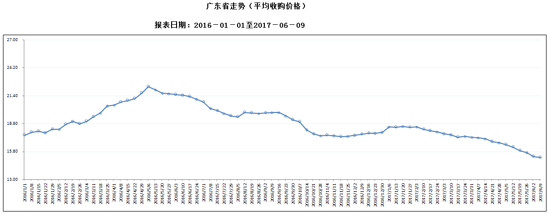 据对全省53家规模以上生猪定点屠宰样本企业监测统计,2017年6月3-9日,生猪平均收购价格为15.20元/公斤,较前一周下降0.72%,较去年同期下降29.04%。本周较上周环比降幅较大的地区有潮州市4.05%,肇庆市3.86%,河源市3.08%,但仍有7个市呈上涨态势,其中韶关、江门、佛山、东莞和汕尾涨幅均超1%。