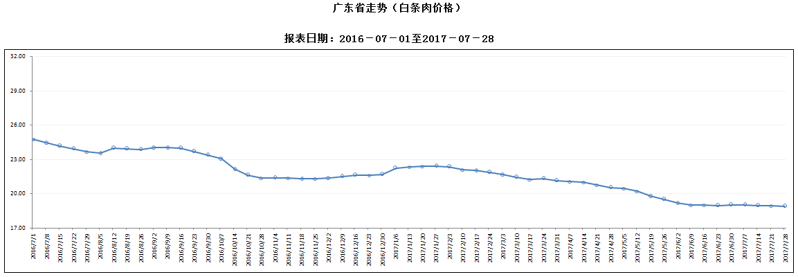 白条肉平均出厂价格为18.89元/公斤,较前一周下降0.21%,较去年同期下降20.33%。本周较上周环比降幅较大的地区有湛江市2.04%,中山市1.81%,肇庆市1.47%,但仍有6个市呈上涨态势,其中深圳涨幅超过1%。(畜禽屠宰管理处 )