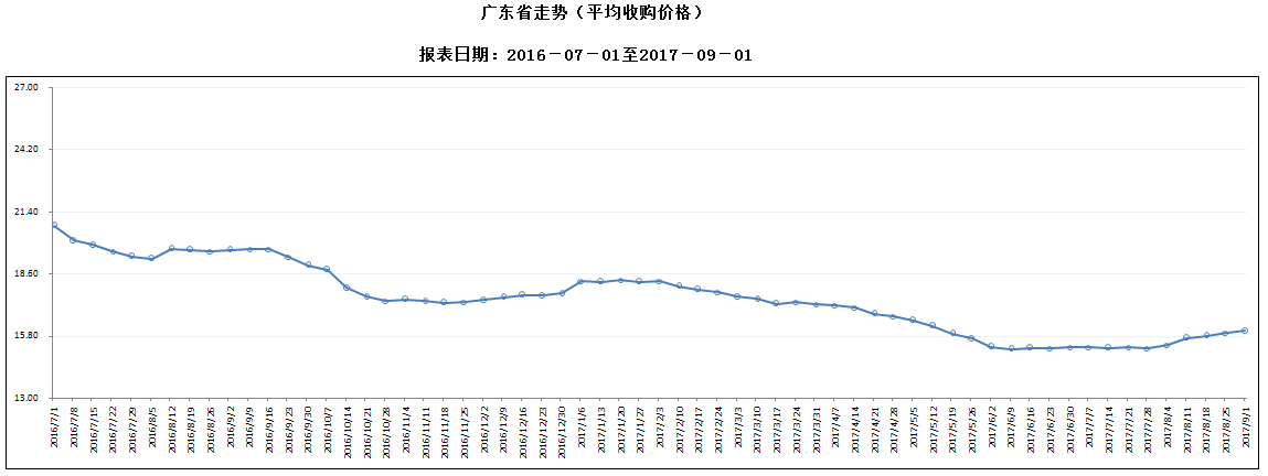 据对全省53家规模以上生猪定点屠宰样本企业监测统计,2017年8月26-9月1日,生猪平均收购价格为16.01元/公斤,较前一周上涨0.50%,较去年同期下降18.52%。本周较上周环比涨幅较大的地区有云浮市3.31%,清远市2.44%,深圳市2.02%,但仍有4个市呈下降态势,降幅均超过1%。