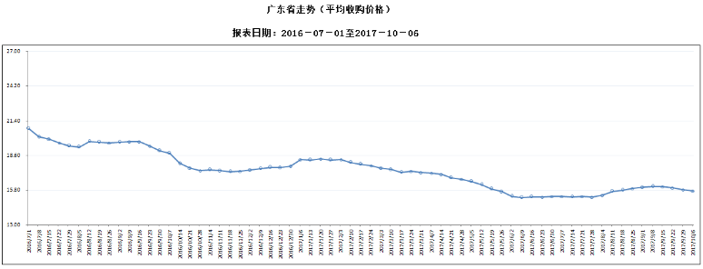 据对全省53家规模以上生猪定点屠宰样本企业监测统计,2017年9月30-10月6日,生猪平均收购价格为15.73元/公斤,较前一周下降0.57%,较去年同期下降16.15%。本周较上周环比降幅较大的地区有汕头市4.43%,深圳市2.61%,肇庆市1.75%,但仍有5个市呈上涨态势,其中湛江涨幅超过1%。