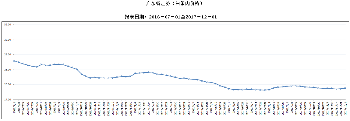 据对全省53家规模以上生猪定点屠宰样本企业监测统计,2017年11月25-12月1日,生猪平均收购价格为15.46元/公斤,较前一周上涨0.65%,较去年同期下降11.15%。本周较上周环比涨幅较大的地区有肇庆市2.65%,湛江市2.53%,韶关市2.31%,但仍有3个市呈下降态势,其中江门降幅超过2%。