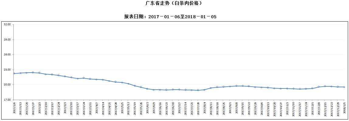 白条肉平均出厂价格为19.54元/公斤,较前一周下降0.05%,较去年同期下降12.30%。本周较上周环比降幅较大的地区有深圳市5.05%,清远市3.01%,东莞市1.44%,但仍有5个市呈上涨态势,其中茂名涨幅超过3%。(畜禽屠宰管理处)