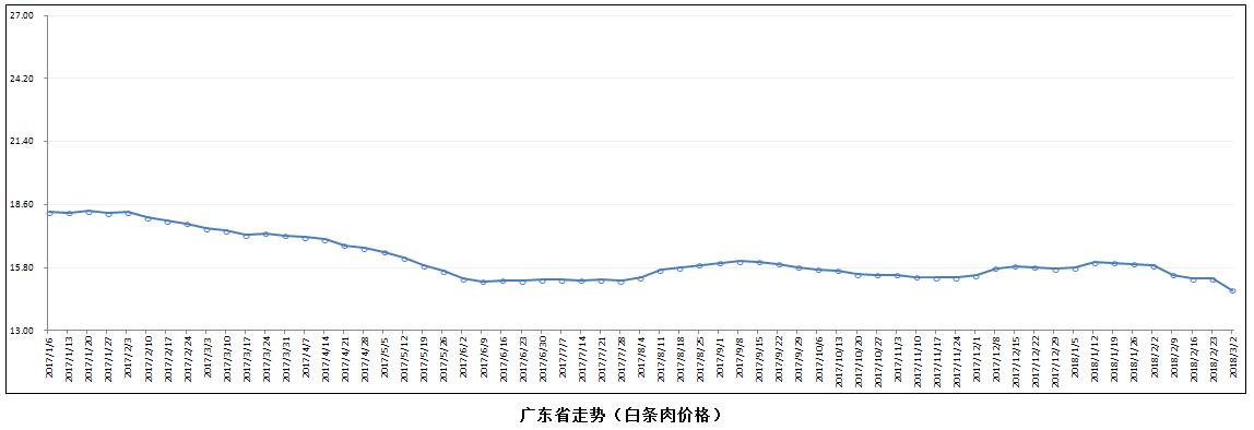 白条肉平均出厂价格为18.77元/公斤,较前一周下降2.49%,较去年同期下降13.22%。本周较上周环比降幅较大的地区有阳江市5.57%,珠海市5.26%,中山市4.34%,但仍有3个市呈上涨态势,其中梅州涨幅超过1%。(畜禽屠宰管理处)