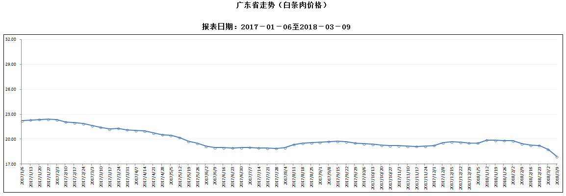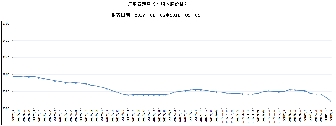 据对全省53家规模以上生猪定点屠宰样本企业监测统计,2018年3月3-9日,生猪平均收购价格为14.15元/公斤,较前一周下降4.46%,较去年同期下降18.91%。本周较上周环比降幅较大的地区有珠海市8.57%,湛江市6.80%,茂名市6.72%。