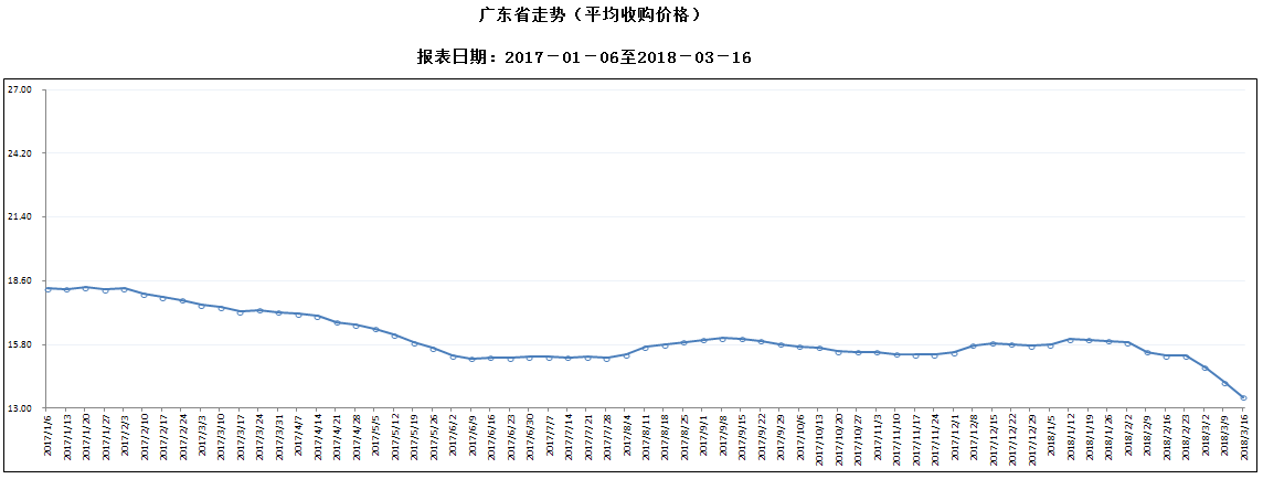 据对全省53家规模以上生猪定点屠宰样本企业监测统计,2018年3月10-16日,生猪平均收购价格为13.49元/公斤,较前一周下降4.66%,较去年同期下降15.95%。本周较上周环比降幅较大的地区有韶关市7.54%,梅州市7.33%,珠海市7.03%。