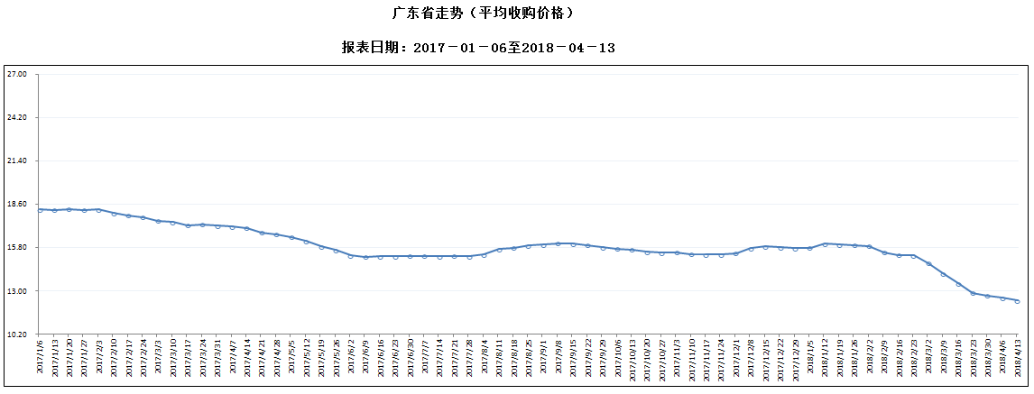 据对全省53家规模以上生猪定点屠宰样本企业监测统计,2018年4月7-13日,生猪平均收购价格为12.40元/公斤,较前一周下降1.35%,较去年同期下降27.36%。本周较上周环比降幅较大的地区有广州市6.77%,汕头市3.72%,深圳市3.53%,但仍有5个市呈上涨态势,其中珠海涨幅超过1%。
