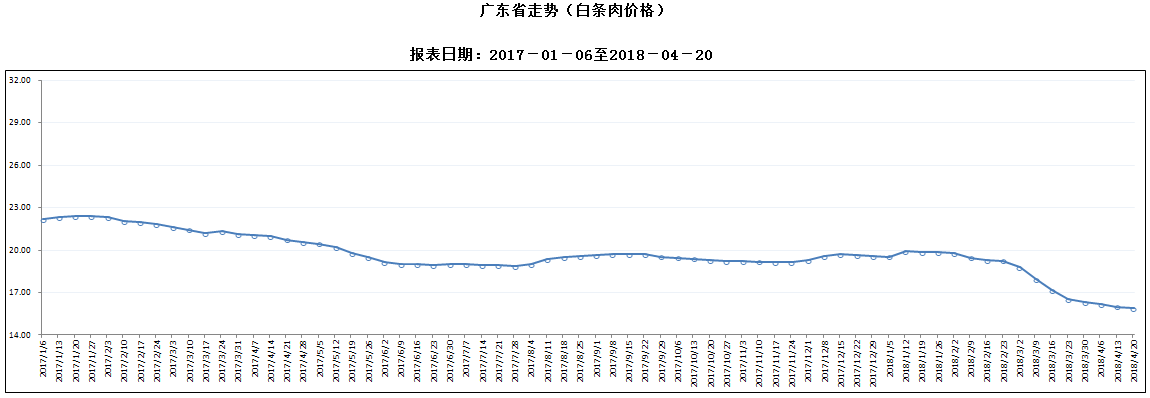 白条肉平均出厂价格为15.91元/公斤,较前一周下降0.56%,较去年同期下降23.29%。本周较上周环比降幅较大的地区有东莞市3.16%,江门市2.41%,潮州市2.12%,但仍有5个市呈上涨态势,其中清远和汕头涨幅超过1%。(畜禽屠宰管理处)