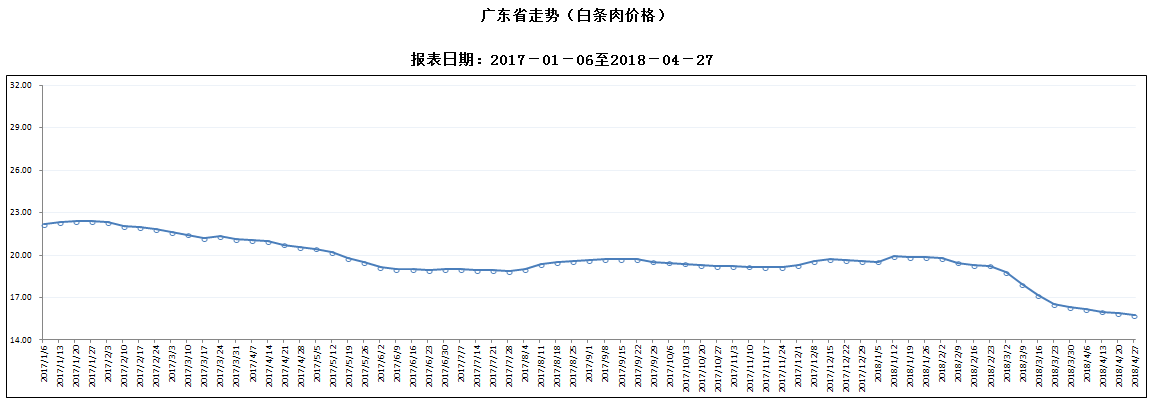 白条肉平均出厂价格为15.75元/公斤,较前一周下降1.01%,较去年同期下降23.32%。本周较上周环比降幅较大的地区有梅州市3.18%,广州市3.15%,江门市3.09%,但仍有4个市呈上涨态势,其中阳江涨幅超过1%。(畜禽屠宰管理处)