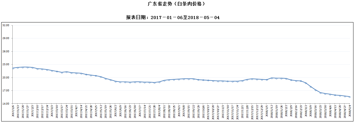 据对全省53家规模以上生猪定点屠宰样本企业监测统计,2018年4月28-5月4日,生猪平均收购价格为11.95元/公斤,较前一周下降1.24%,较去年同期下降27.58%。本周较上周环比降幅较大的地区有清远市5.84%,深圳市5.49%,湛江市3.41%,但仍有3个市呈上涨态势,其中梅州涨幅超过3%。