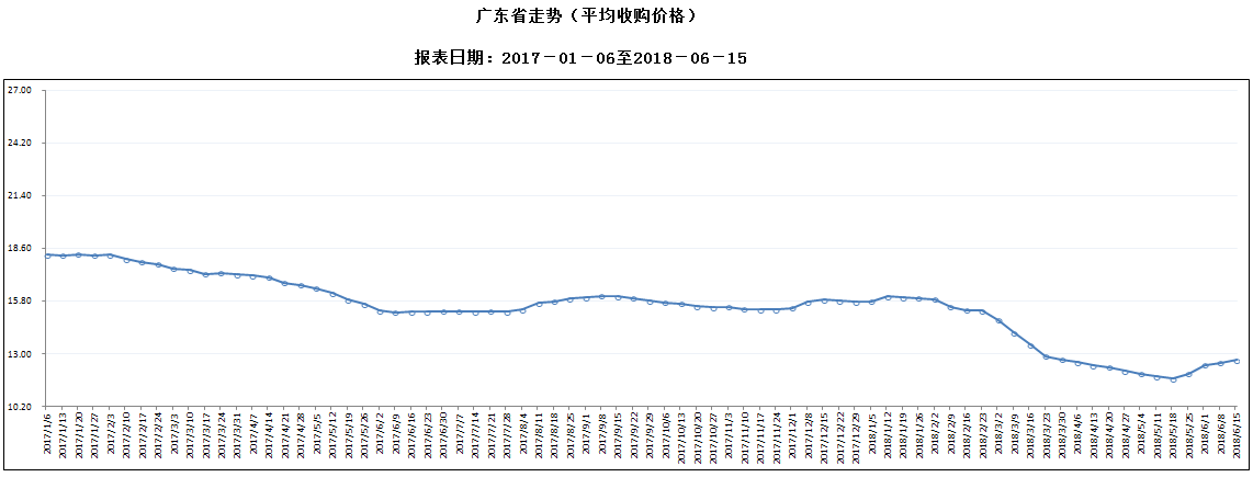 据对全省53家规模以上生猪定点屠宰样本企业监测统计,2018年6月9-15日,生猪平均收购价格为12.67元/公斤,较前一周上涨1.04%,较去年同期下降16.86%。本周较上周环比涨幅较大的地区有珠海市5.18%,云浮市4.70%,韶关市3.57%,但仍有4个市呈下降态势,其中肇庆降幅超过3%。