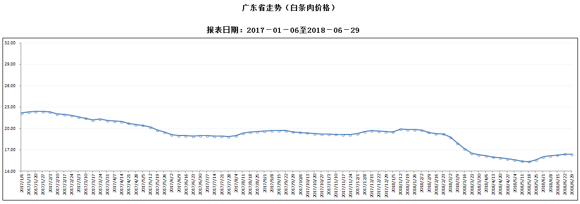 白条肉平均出厂价格为16.42元/公斤,较前一周下降0.06%,较去年同期下降13.58%。本周较上周环比降幅较大的地区有佛山市2.31%,江门市1.46%,东莞市1.10%,但仍有7个市呈上涨态势,其中韶关涨幅超过2%。(畜禽屠宰管理处)