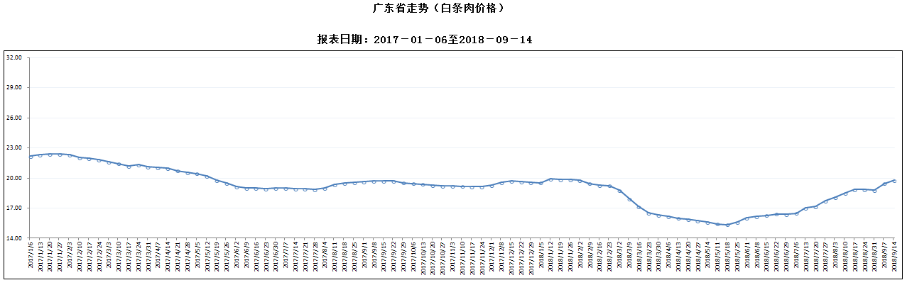 广东省屠宰生猪及肉品价格周报(2018年第37周)生猪平均收购价环比上涨、同比下降 白条肉出厂价环、同比均上涨