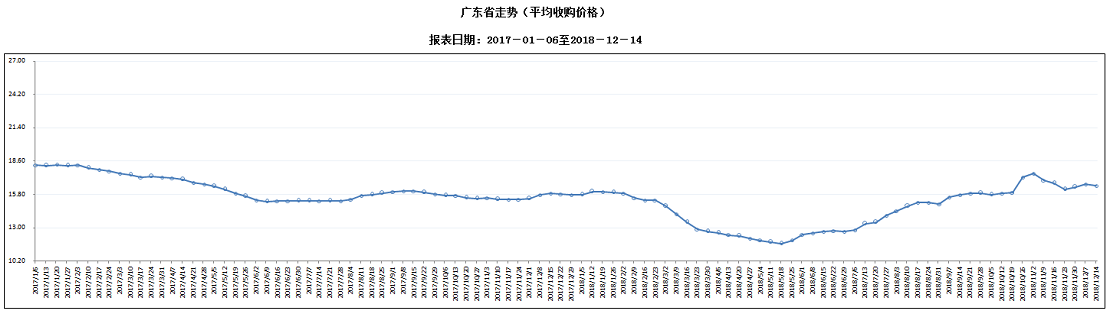 据对全省53家规模以上生猪定点屠宰样本企业监测统计,2018年12月8-14日,生猪平均收购价格为16.54元/公斤,较前一周下降0.72%,较去年同期上涨4.22%。本周较上周环比降幅较大的地区有揭阳市2.79%,梅州市1.97%,清远市1.72%,但有5个市呈上涨态势,其中深圳涨幅超过2%。