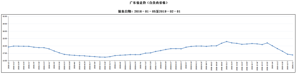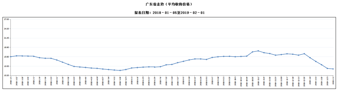 据对全省52家规模以上生猪定点屠宰样本企业监测统计,2019年1月26-2月1日,生猪平均收购价格为12.14元/公斤,较前一周下降1.22%,较去年同期下降23.65%。本周较上周环比降幅较大的地区有汕头市4.95%,汕尾市4.89%,江门市4.14%,但有6个市呈上涨态势,其中茂名和梅州涨幅超过2%,阳江涨幅超过3%,珠海涨幅超过5%。