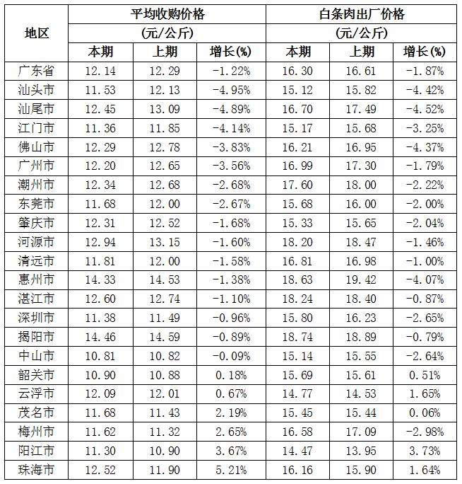白条肉平均出厂价格为16.30元/公斤,较前一周下降1.87%,较去年同期下降17.72%。本周较上周环比降幅较大的地区有汕尾市4.52%,汕头市4.42%,佛山市4.37%,但有5个市呈上涨态势,其中阳江涨幅超过3%。