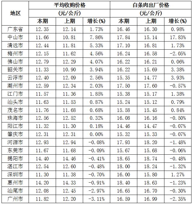 白条肉平均出厂价格为16.46元/公斤,较前一周上涨0.98%,较去年同期下降15.46%。本周较上周环比涨幅较大的地区有中山市17.83%,云浮市3.93%,韶关市3.38%,但有12个市呈下降态势,其中广州和梅州降幅均超过2%。