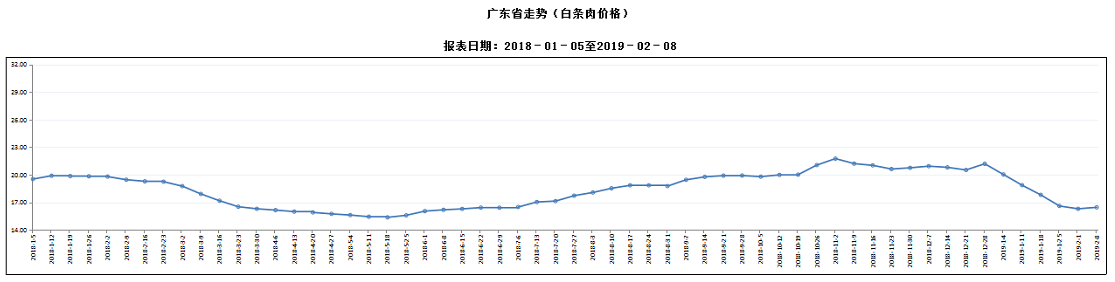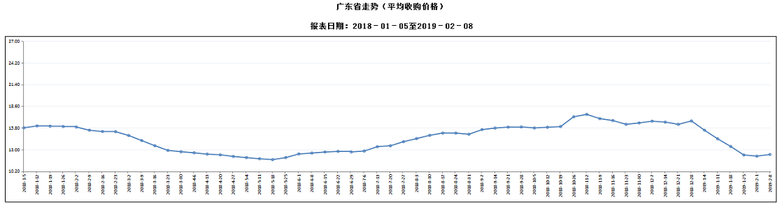 据对全省52家规模以上生猪定点屠宰样本企业监测统计,2019年2月2-8日,生猪平均收购价格为12.35元/公斤,较前一周上涨1.73%,较去年同期下降20.27%。本周较上周环比涨幅较大的地区有中山市7.86%,清远市5.33%,梅州市4.56%,但有8个市呈下降态势,其中广州和汕尾降幅分别超过3%和2%。