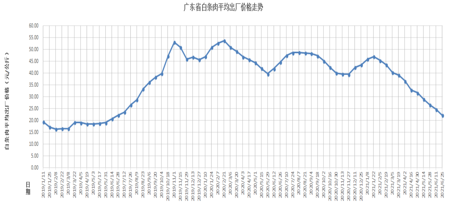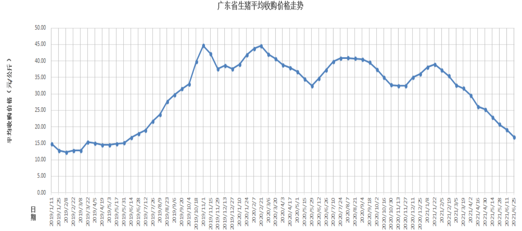 据对全省20个地市199家生猪定点屠宰企业监测统计,2021年6月12-25日,生猪平均收购价格为16.93元/公斤,环比下降11.50%,同比下降54.56%。环比降幅较大的地区有河源市17.24%,深圳市15.72%,汕头市14.44%。