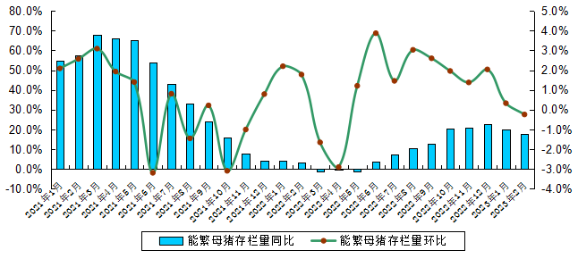 据农业农村部养殖场直联直报信息平台监测数据,2023年2月,我省能繁母猪存栏量环比下降0.24%,同比上升17.65%。